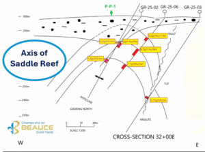 - Les teneurs les plus élevées ont été observées près de l’axe de l’antiforme de type « Saddle Reef ». Le sondage GR-25-02 a recoupé 2,0 g/t Au sur 4,0 m, incluant 5,2 g/t Au sur 0,5 m.
