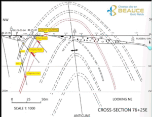 Beauce Gold Fields explore actuellement des systèmes antiformes récemment découverts qui pourraient avoir contribué au développement des vastes placers aurifères de la Beauce. Le modèle géologique de la Société suggère que l’or de placer dans le paléocanal de Beauce Gold, y compris les célèbres grosses pépites du 19e siècle, s’est formé dans des poches de quartz sous tension au sein des axes antiformes en dôme stratifié, exemplifiés par des formations de Saddle Reef. Parmi les formations mondiales notables de Saddle Reef figurent les champs aurifères de Bendigo en Australie (plus de 60 millions d’onces) et le dépôt de haute qualité de Dufferin en Nouvelle-Écosse.